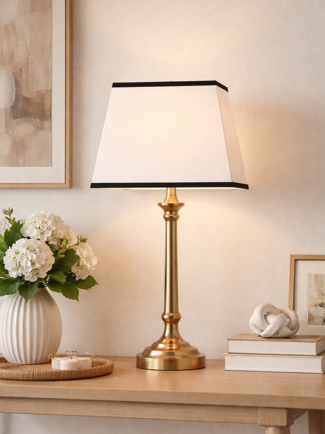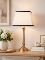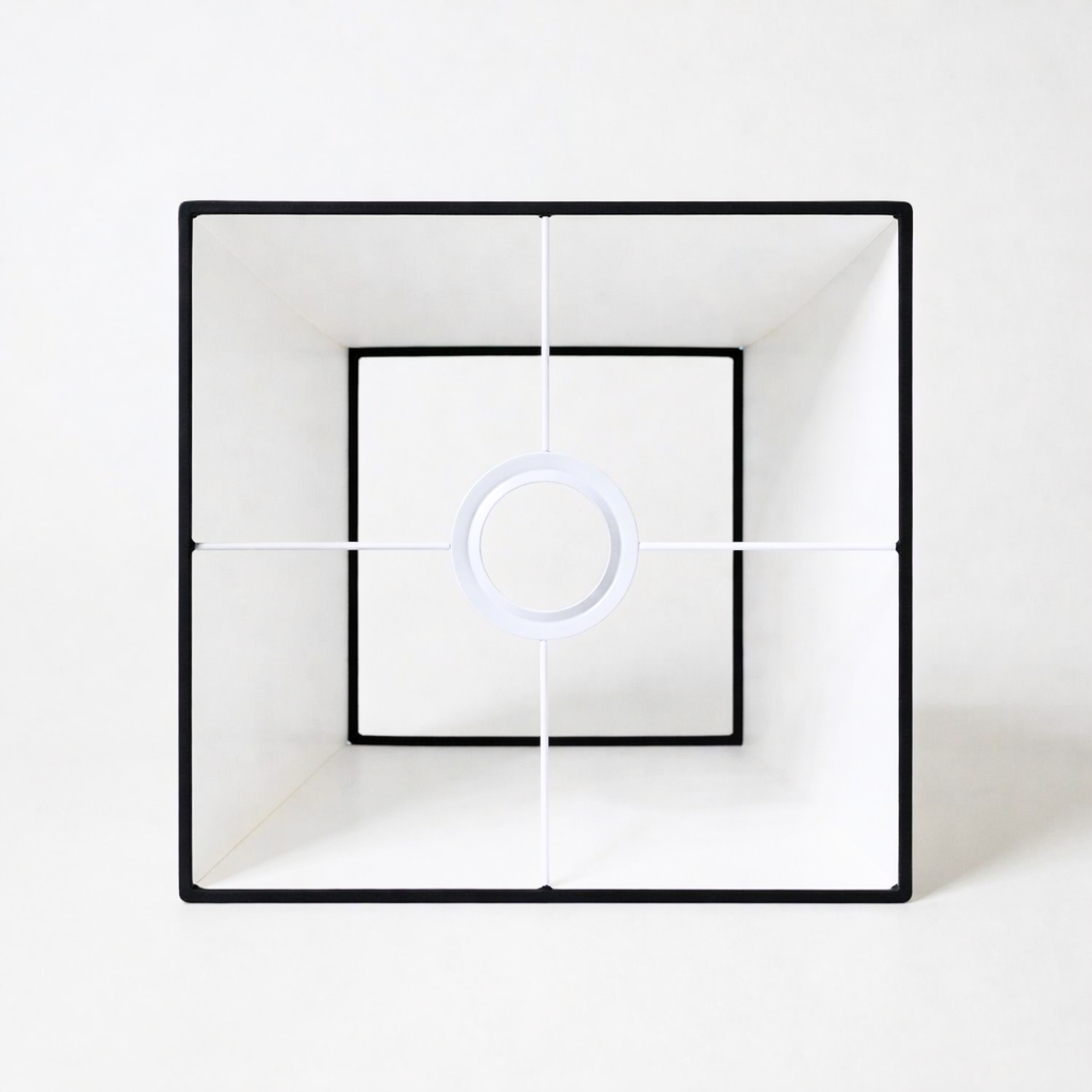 Conseil Pro : Un abat-jour pyramide blanc à bord noir apporte une ligne graphique très structurée. Associez-le idéalement à un pied à base carrée (métal noir mat, laiton brossé ou marbre) pour renforcer l’équilibre.