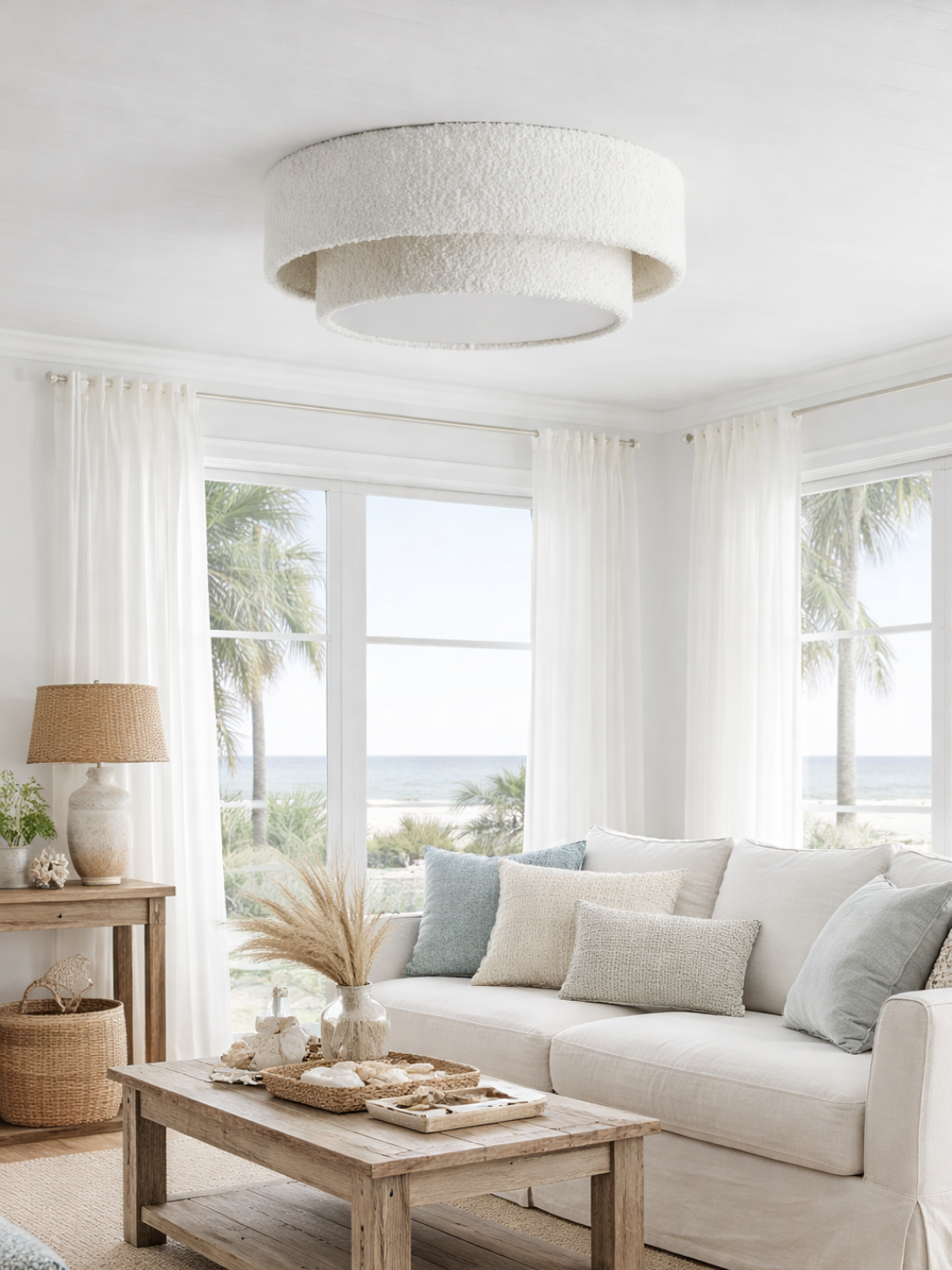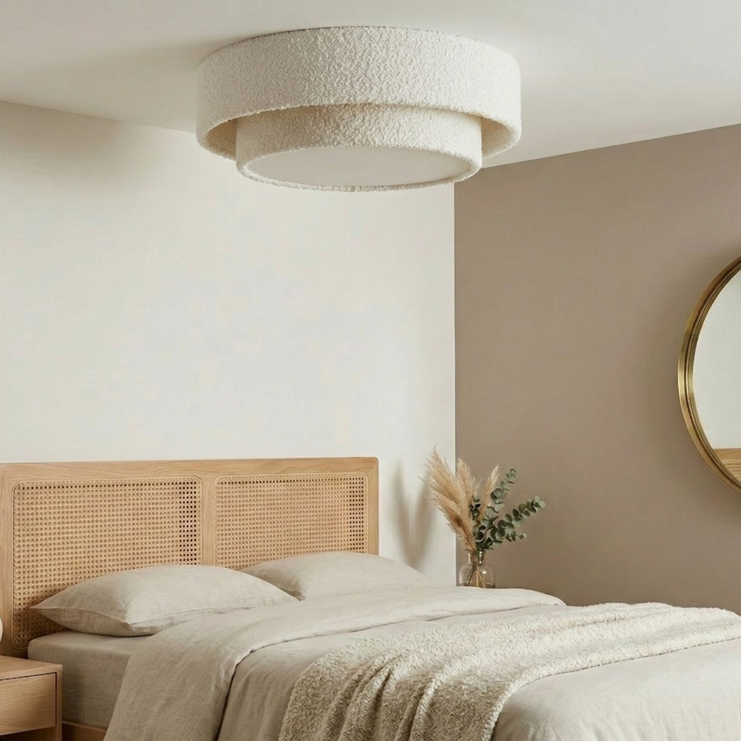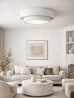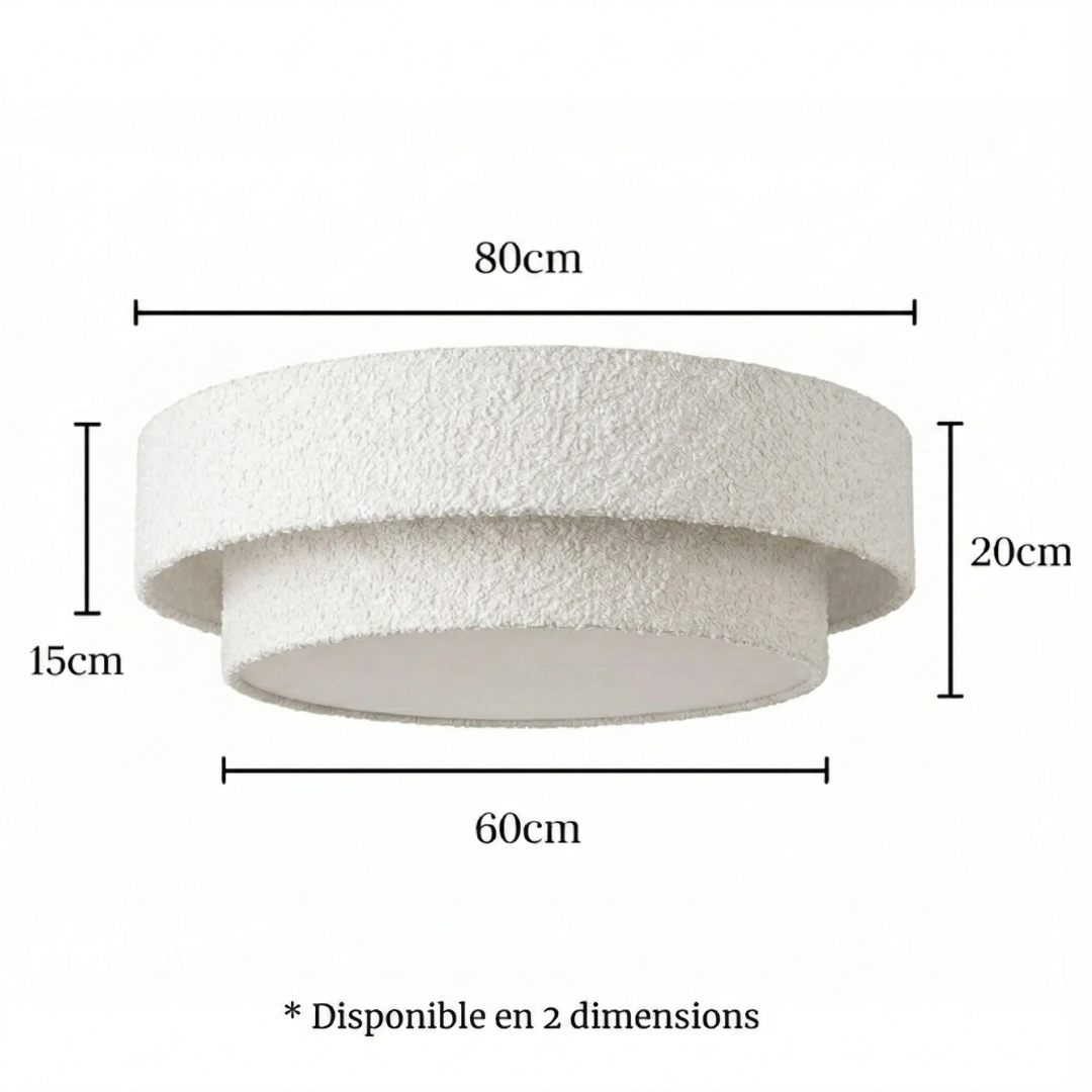 Ce plafonnier se compose d'une structure à double étage habillée d'un tissu bouclette blanc ultra-tendance. Sa texture bouclée capte la lumière et crée des jeux d'ombres subtils, offrant un aspect visuel doux et chaleureux même lorsqu'il est éteint.