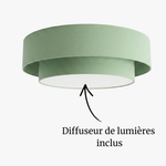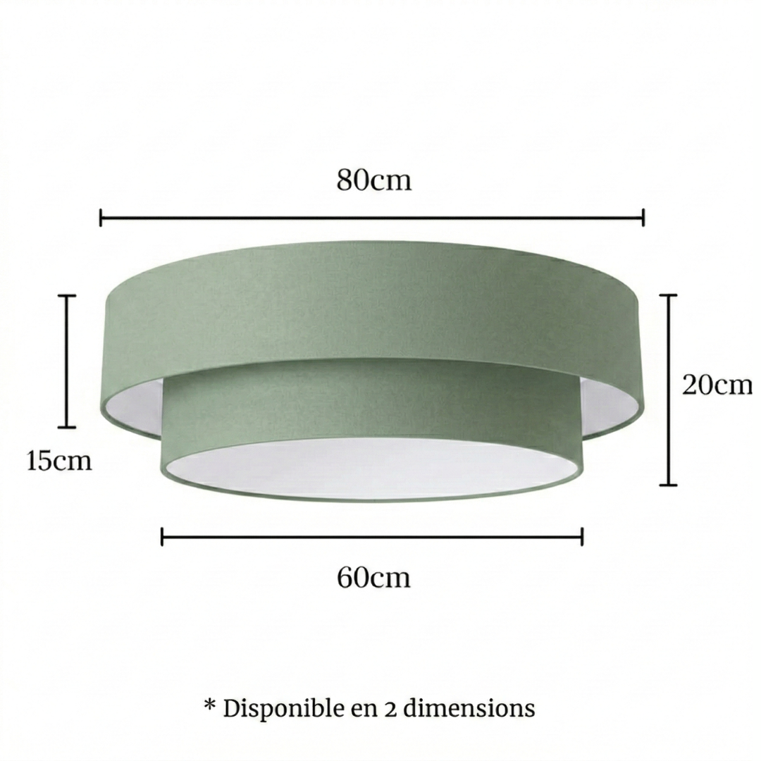Ce plafonnier se distingue par sa structure à double abat-jour cylindrique, habillée d'un tissu 100% coton vert sauge. Cette teinte tendance et intemporelle apporte une touche de fraîcheur à votre plafond, tout en conservant une géométrie stricte et élégante.
